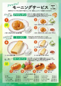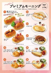 | ☆モーニングサービス OPEN~11:00 お好きなドリンクに+180(税込)で下記のメニューをお付けします。 ☆プレミアムモーニング ドリンク代金+500(税込)でお付けします | ||